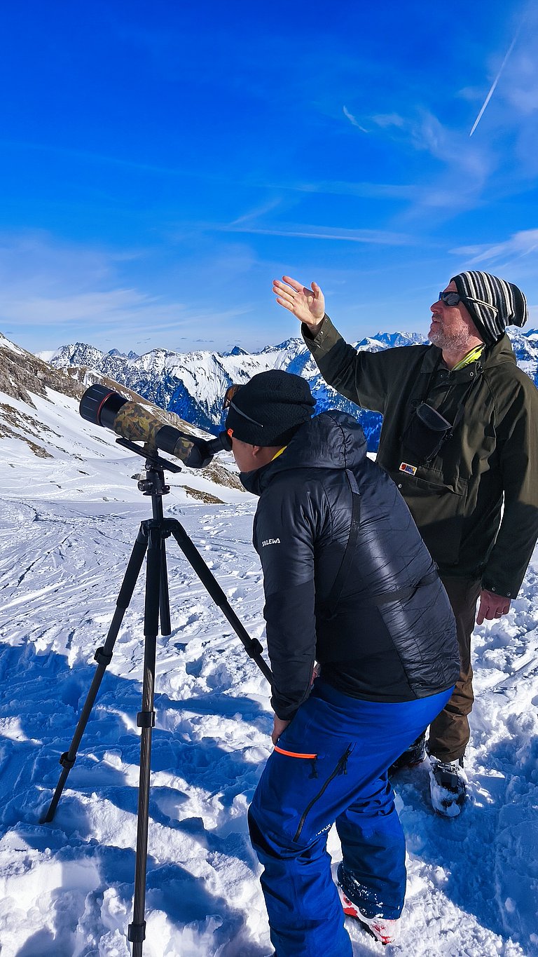 Am Samstagnachmittag fand der Theorieteil im Haus Oberstdorf statt. In einem interaktiven und kurzweiligen Vortrag wurden den ca. 40 Teilnehmern verschiedene Inhalte zu Lawinen und Nachhaltigkeit im Wintersport beigebracht, aufgefrischt und vertieft. Am Sonntag konnte zuvor Erlerntes am Gipfel des Nebelhorns in der Praxis umgesetzt werden. Besonders spannend war in diesem Zusammenhang eine Gamsbeobachtung und das Lesen von Tierspuren im Schnee mit tatkräftiger Unterstützung des Alpinium – Zentrum Naturerlebnis Alpin und dem Naturpark Nagelfluhkette. Die Teilnehmer zeigten sich begeistert von der Tier- und Pflanzenwelt und zugleich auch dankbar über den wertvollen Input. „Ich wusste gar nicht, welche schützenswerte Ökosysteme sich links und rechts der Pisten erstrecken. Ich werde das in Zukunft bei meinen Tourenplanungen unbedingt berücksichtigen“, so die Meinung eines Teilnehmers.