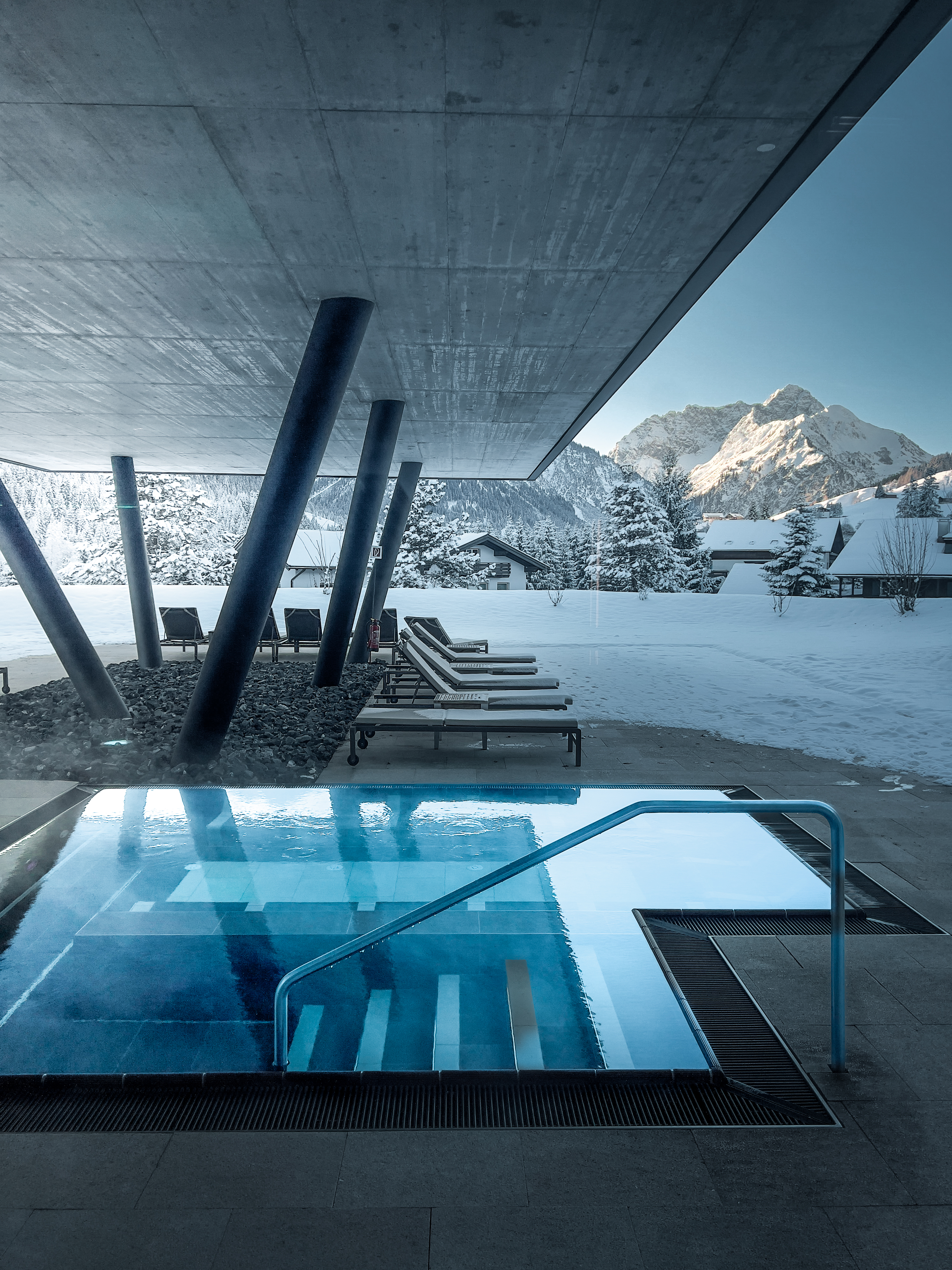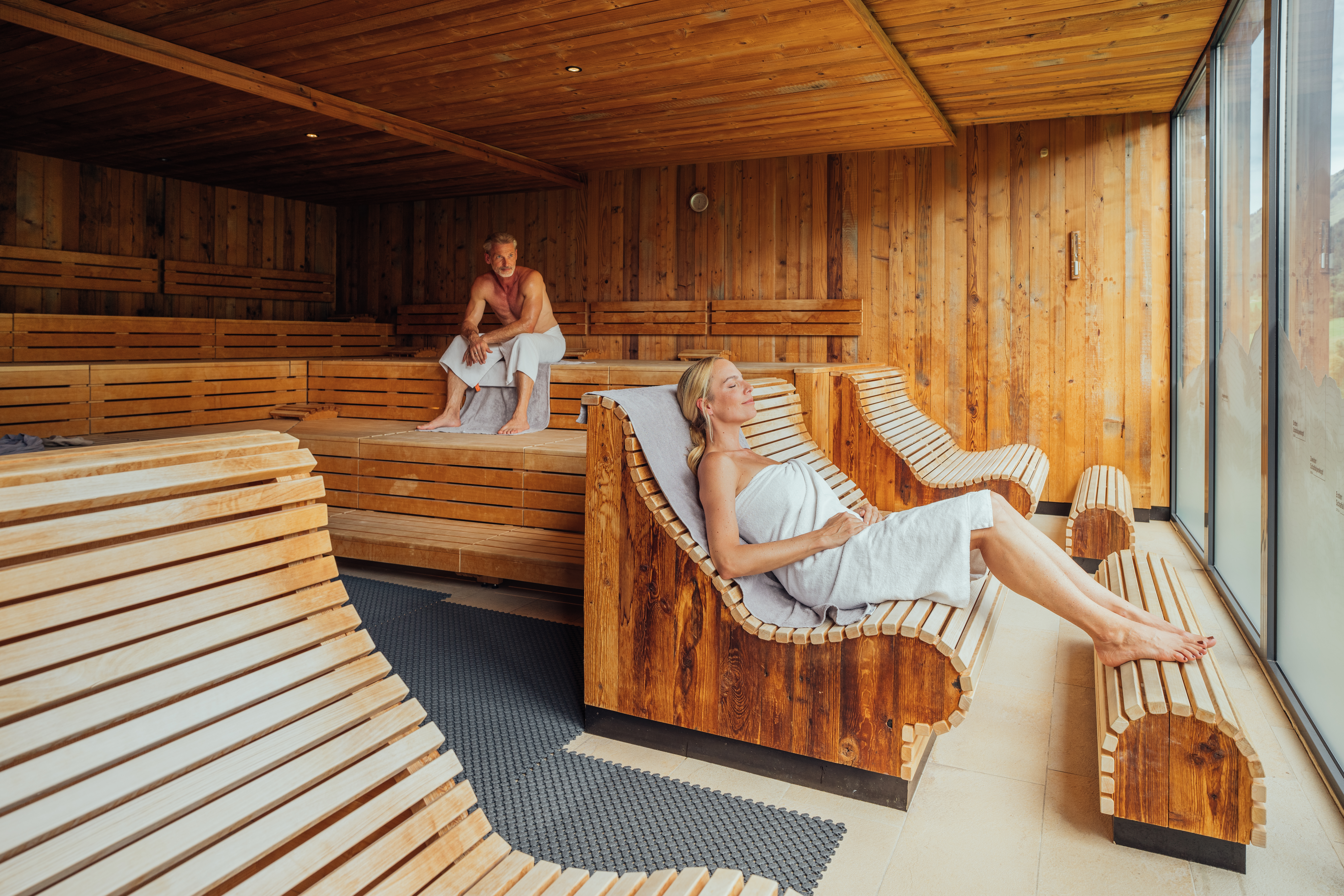 Eintauchen, abtauchen und dem Alltag davon schwimmen. Auftauchen inmitten der Berge. Das können Gäste im 25 Meter langen Outdoor Infinity Pool mit anschließender Entspannung bei einem spritzigen Cocktail in der Fire Place Lounge. Im 18 Meter langen Innenpool haben Gäste zusätzlich ganze 180 Quadratmeter Wasserfläche zur Verfügung. Die Elemente Feuer, Wasser und Luft spiegeln sich in der vielfältigen Saunawelt wider. Dort finden Gäste Saunen für jeden Geschmack und ihre individuellen Bedürfnisse. Belebende Wärme verströmt das 45°C warme Dampfbad bei hoher Luftfeuchtigkeit und mit Kräuterdüften. Bei Licht und Wärme entspannen gestresste Körper im ca. 65°C warmen Sanarium. Bei sanfter Berührung versprüht die Duftsäule einen angenehm aromatisierten Dampf. Im Außenbereich kommt man in der neu gestalteten Hüttensauna ordentlich ins Schwitzen – die neugestaltete finnische Sauna mit Altholz und bodentiefer Verglasung überzeugt mit 90°C Hitze und bei einem Aufguss genießt man den beeindruckenden Panoramablick auf die Bergwelt. Sitz- und Fußbänke, erhitzte Wärmebänke aus Naturstein, ein Trinkwasserbrunnen sowie Gletscherduschen und Eisbrunnen ergänzen das Saunaerlebnis. Neugestaltet wurde außerdem die Salz-Lounge, in der man auf ergonomisch geformten Wärmeliegen fein versprühten Salznebel inhaliert.
