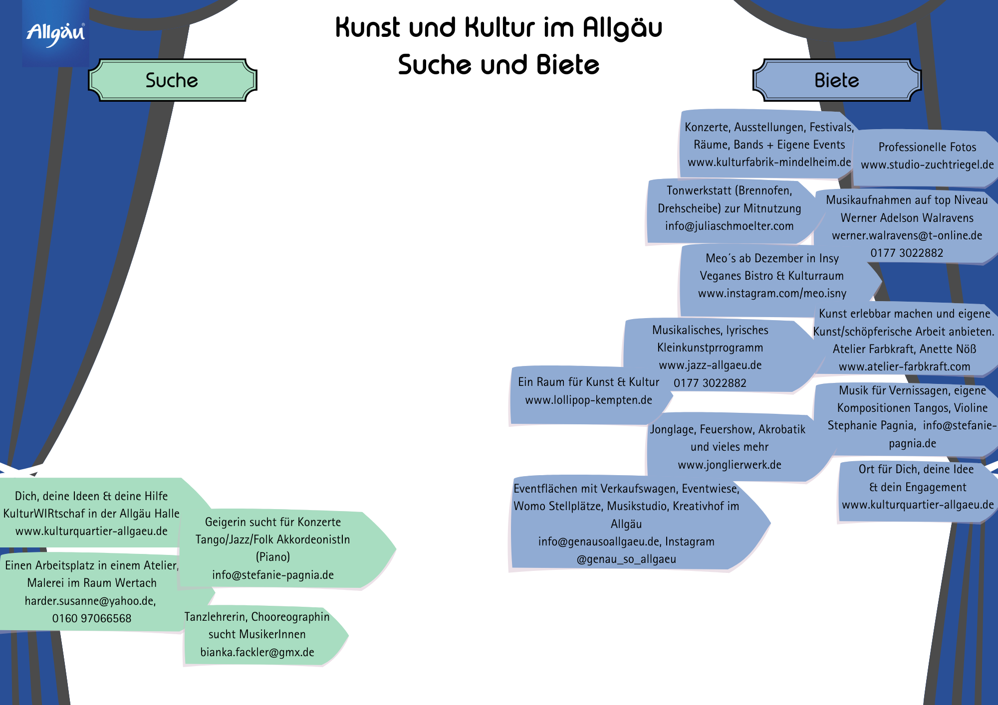 Die Gäste des 1. Allgäuer KulturPlausch konnten auf einem Schwarzen Brett Kulturelles und Künstlerisches anbieten und suchen. Hier gibt es die digitale Version davon zum Herunterladen.